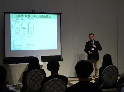 当日は、高校生や大学生などの学生を対象に本学の髙村昇教授が「放射線について」と題して放射線被ばくと健康影響について講演を行い、その後北海道大学の佐藤努教授が「復興再生土の再利用について」と題して、復興再生土について実証事業の内容を含めて解説しました。